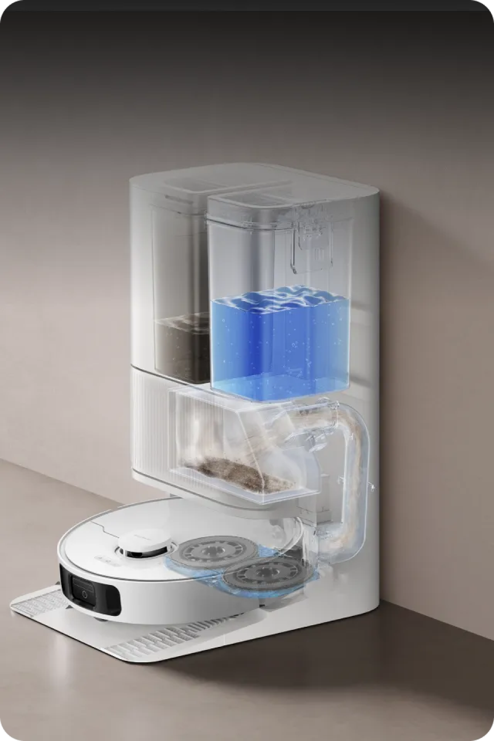 The self-cleaning mops efficiently tackle embedded oils, stains, and pigments, aided by the vacuum's 4.5L clean water tank and 4L used water tank.