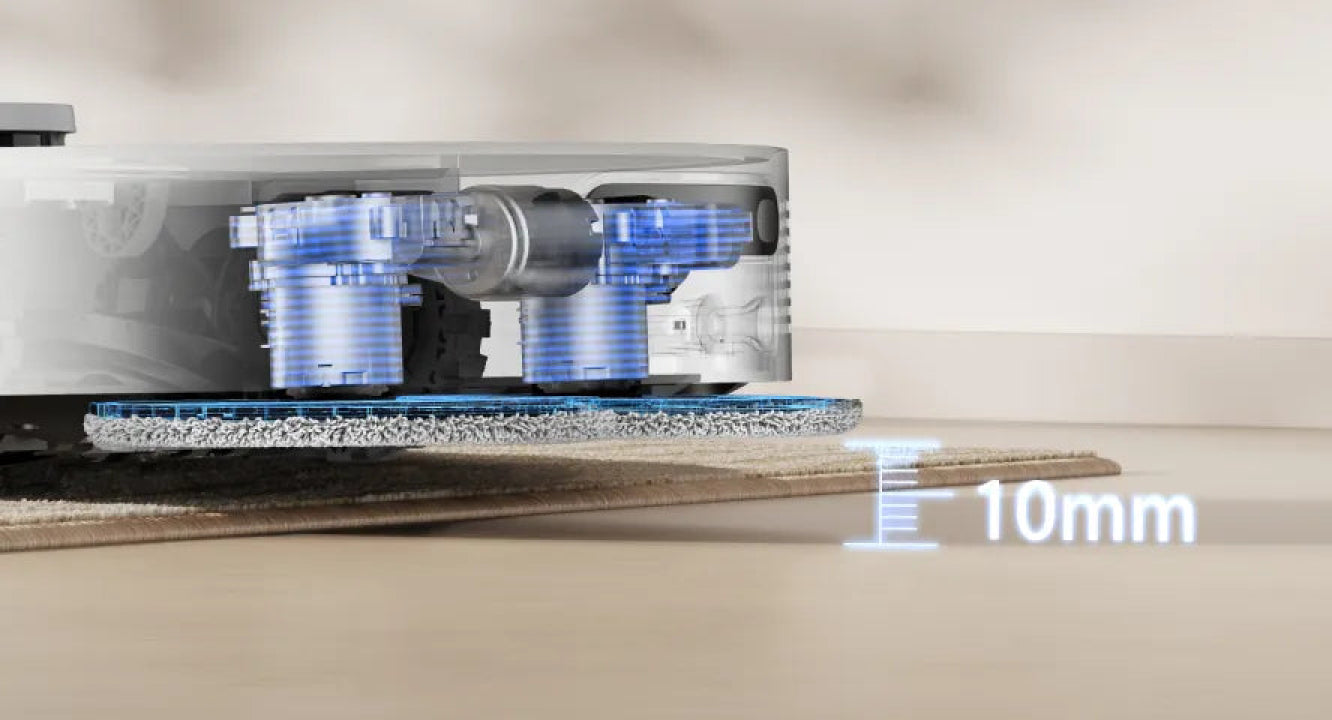The vacuum features Ultrasonic Carpet Sensing, automatically boosting suction on carpets and removing embedded dirt for a deep clean. Plus, its mops lift up to 10.5mm* on
