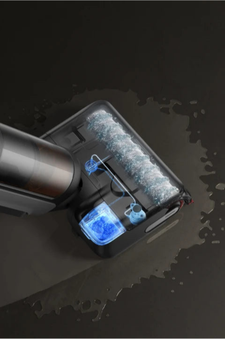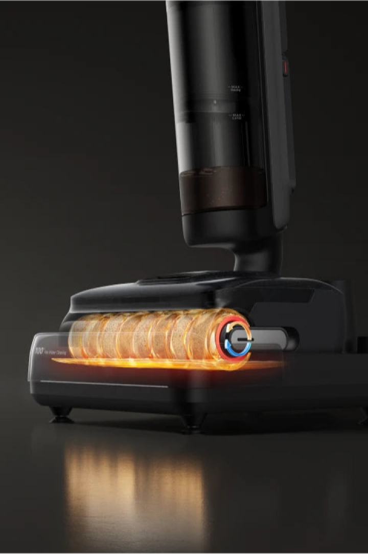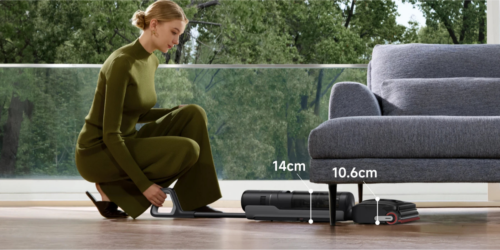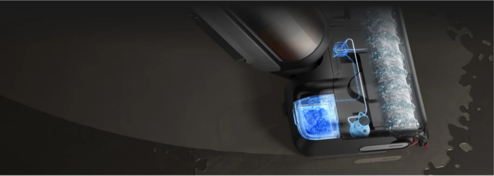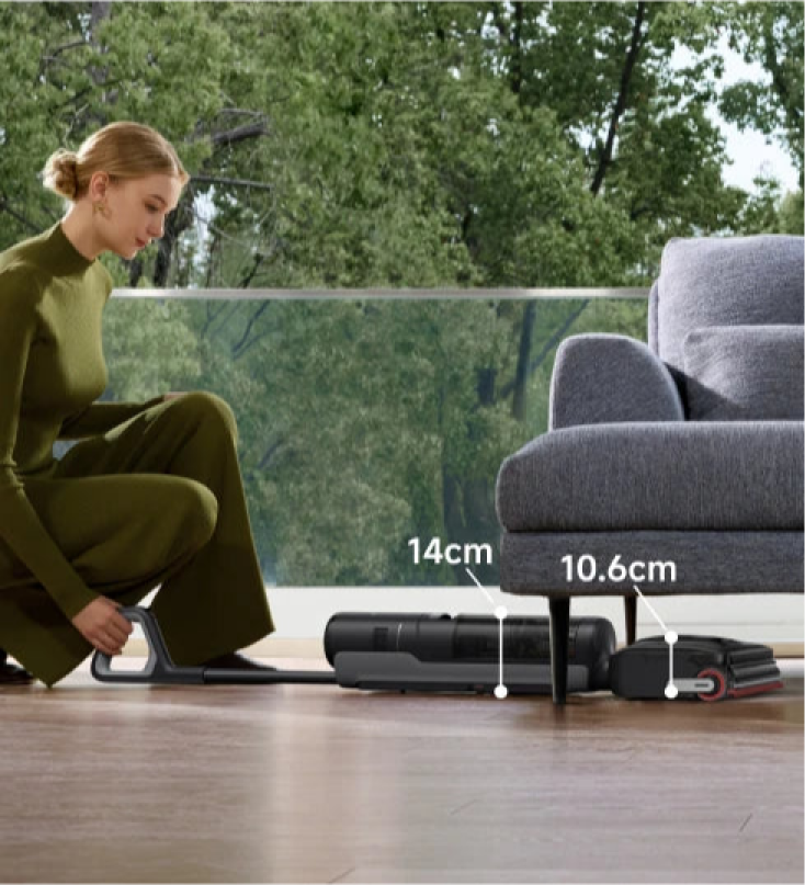 H15 Mix fully reclines to 180°*, hugging the floor to reach under beds, sofas, and low furniture effortlessly. Its used water tank keeps dirty water contained, protecting the motor while maintaining up to 23,000Pa of powerful suction to conquer even the tightest spaces.