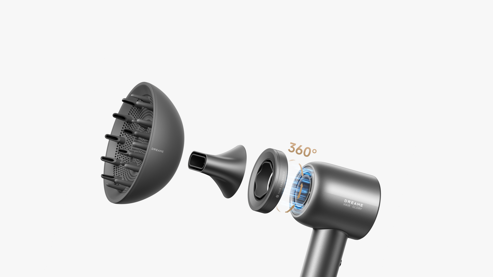 Hair Glory Mix streamlines blow-drying with interchangeable magnetic nozzles tailored for diverse hair types and needs, including a smoothing nozzle, diffuser nozzle, and a unique perfume nozzle.